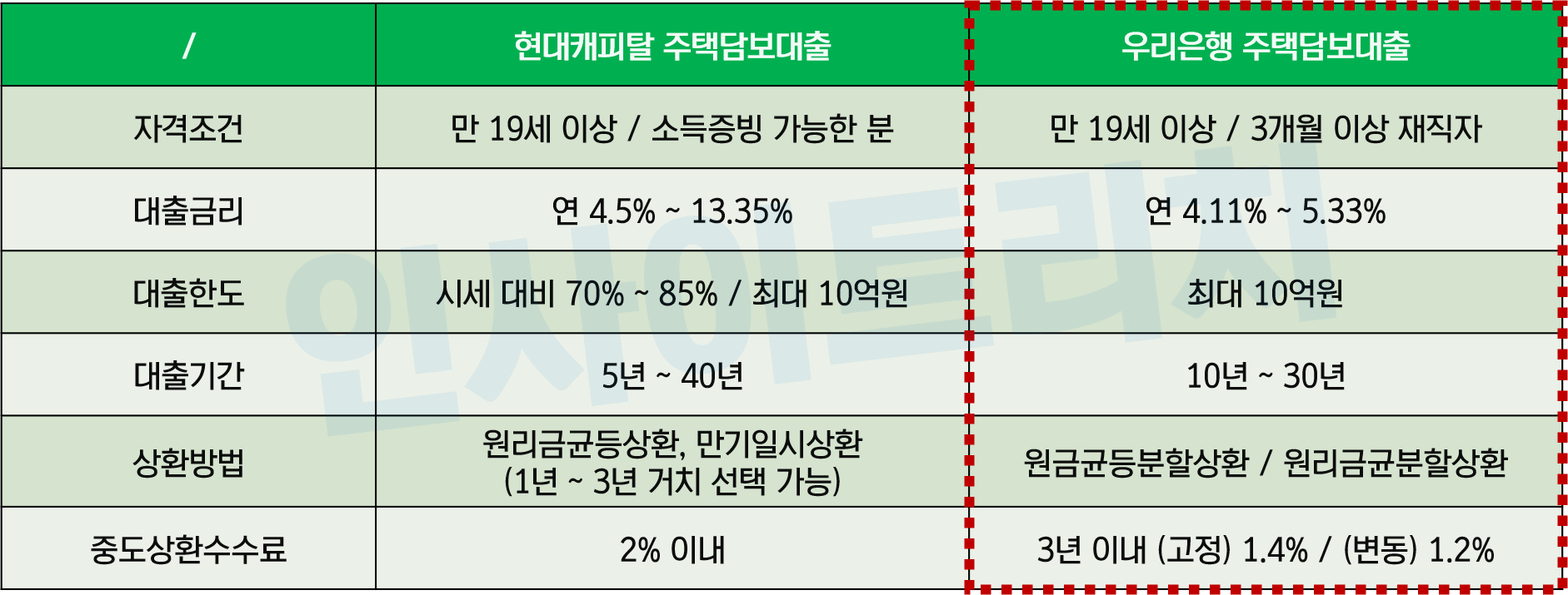 1금융권 주담대는 조건이 비슷하므로 2금융권 대표 상품인 현대캐피탈과 비교해 보겠습니다. 우리은행은 금리가 낮고, 중도상환수수료가 비교적 낮다는 장점이 있습니다. 하지만 대출 기간이 최대 30년으로 한정되어 있고, 만기 일시 상환이 불가능한 점은 단점으로 꼽힙니다.